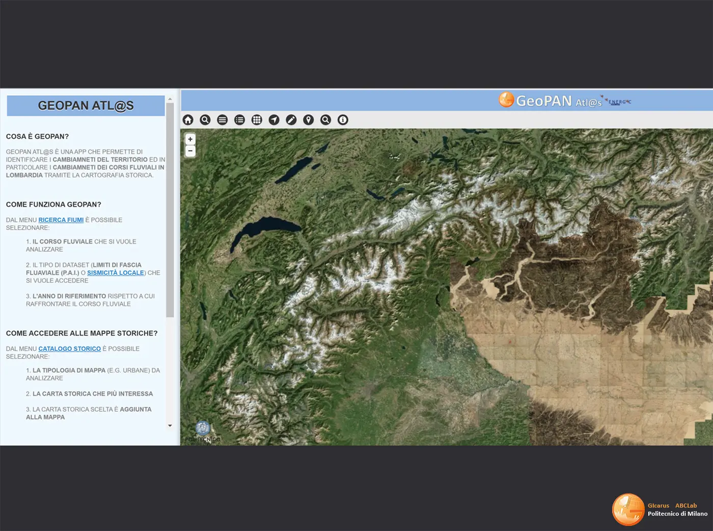 CIP-ICT-PSP.2013.2.2a – Open data – Open data experimentation and innovation building on geographic information, CIP-ICT-PSP-13-7 Theme 2 – Digital content, OD creativity. Polimi PI R. Brumana, in charge for GEOPANAPP implementation, Multisource OD-GOD access&semantic profiling. POLIMI PI. Awarded by the EC-ICT Radar Innovation. GEOPAN APP Polimi PI R. Brumana, in charge of GEOPANAPP implementation, Multisource OD-GOD access& semantic profiling. L’applicazione “GeoPAN APP” (Energic OD), sviluppata per mobile e desktop, permette di identificare i cambiamenti del territorio, in particolare dei corsi fluviali in Lombardia, grazie all’impiego della cartografia storica e di Open Data della Regione Lombardia. L’applicativo è stato sviluppato con il contributo di O.G.L. (Ordine Geologi Lombardia) Awarded by the EC-ICT Radar Innovation.