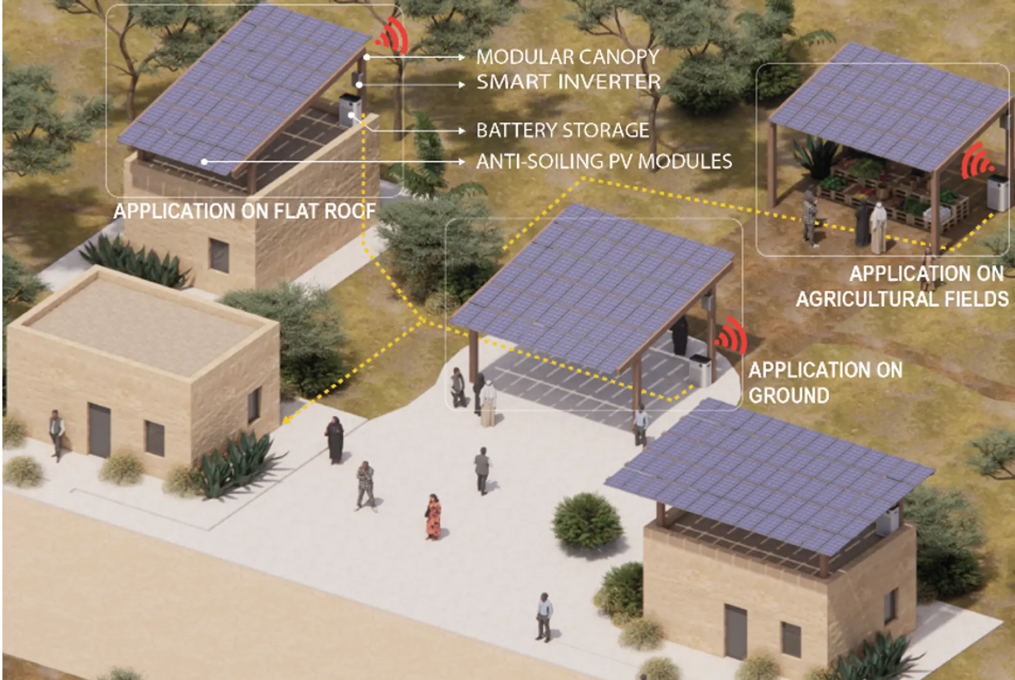 La soluzione tecnologica principale sarà un sistema fotovoltaico (PV) modulare all-inclusive che potrà essere facilmente installato come tettoia leggera sia sui tetti piani dei tipici edifici africani , ma anche a terra come elemento di ombreggiamento/protezione, dotato di moduli fotovoltaici antisporco, batterie riutilizzate, un inverter ibrido per il funzionamento off-grid/on-grid e una logica di controllo intelligente, con capacità di comunicazione, per scambiare dati con altre apparecchiature installate nell'area locale e con una piattaforma di monitoraggio esterna. La soluzione sarà sviluppata tenendo conto delle caratteristiche e delle esigenze specifiche del contesto (presente e futuro, considerando anche gli effetti dei cambiamenti climatici), consentendo alla soluzione proposta di apportare anche ulteriori benefici alla produzione di energia, come la riduzione del surriscaldamento degli edifici e la creazione di nuove attività economiche locali.