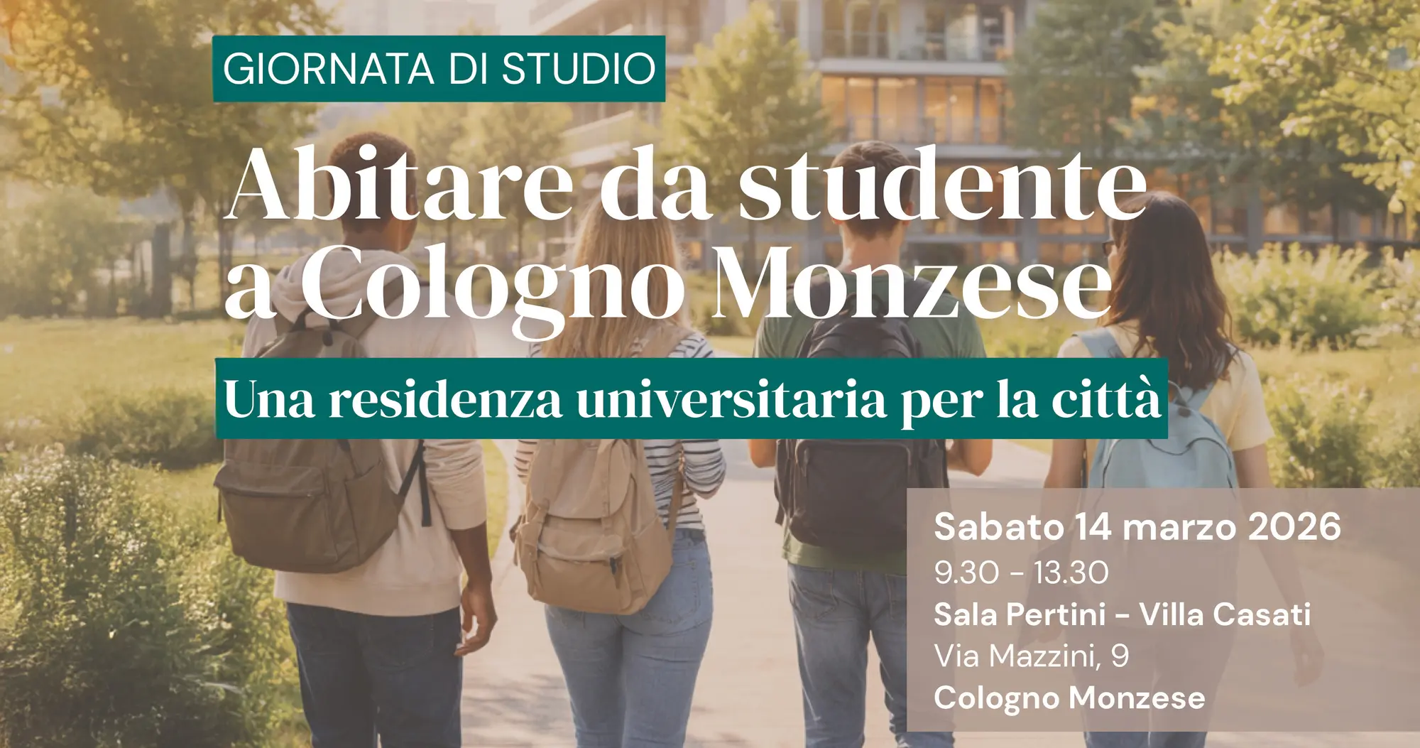 Sabato 14 marzo 2026, presso la Sala Pertini - Villa Casati, Via Mazzini 9, si terrà la Giornata di Studio “Abitare da studente a Cologno Monzese: Una residenza universitaria per la città”.